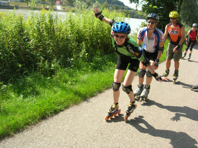 Tag 1 - Wir haben Großes vor! Vor lauter Aufregung wache ich bereits vor dem Weckerklingeln auf. Meine Gedanken kreisen nur darum, ob ich die 1. Etappe heute in meinen relativ neuen Speedskates oder doch lieber in meinen alten, bequemen Sofaskates antreten soll. Ich verlagere die Entscheidung nach hinten und steige erst einmal in den ICE von Leipzig über Nürnberg nach Passau. Dort angekommen, wird das Gepäck im orangefarbenen "Schorli" verstaut und ich ziehe meine Speedis an. Die 1. Etappe führt uns - immerhin 41 Skater aus Frankfurt, Köln, Kalifornien, Zürich, Bern, Leipzig und Cottbus - in 68km von Passau nach Aschach/Österreich. Begleitet werden wir von unserem Kleinbus, in welchem Wasser und kleine Snacks für die Versorgung unterwegs gelagert sind. Darüber hinaus können hier blasengeplagte Skater Teilstrecken zurücklegen. Die Landschaft, welche an uns vorbeizieht, ist einfach nur toll: die Donau windet sich um Kurven und grünbewaldete Hügel, leider bin ich immer viel zu konzentriert auf die Strecke und das Windschatten fahren, so daß ich nicht alles in mich aufsaugen kann. Glücklich und zufrieden komme ich in unserem ersten Übernachtungsort Aschach an.